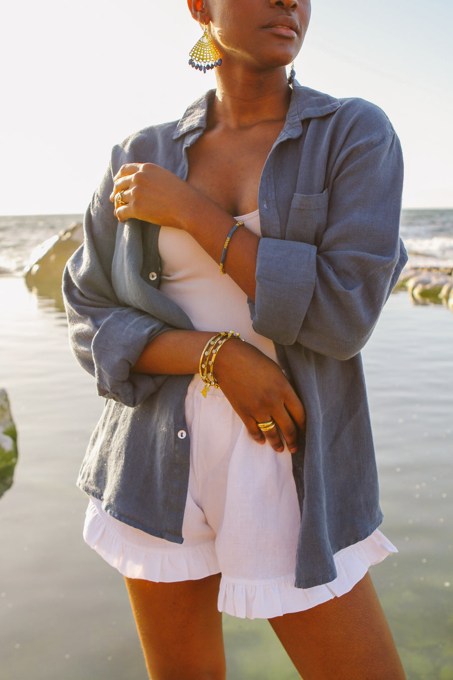 Handmade beaded bracelet , made by our team in Cape Town with Kenyan Brass Beads + fimo beads in nude, stormy blue, ebony or ivory colours.