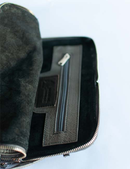 This is a slick medium-sized leather handbag perfect for any occasion. A zip opens to the side of the bag. It also has one zip pocket and a nifty slip pocket that is great for keeping your cellphone in easy reach. Lined with suede inside.